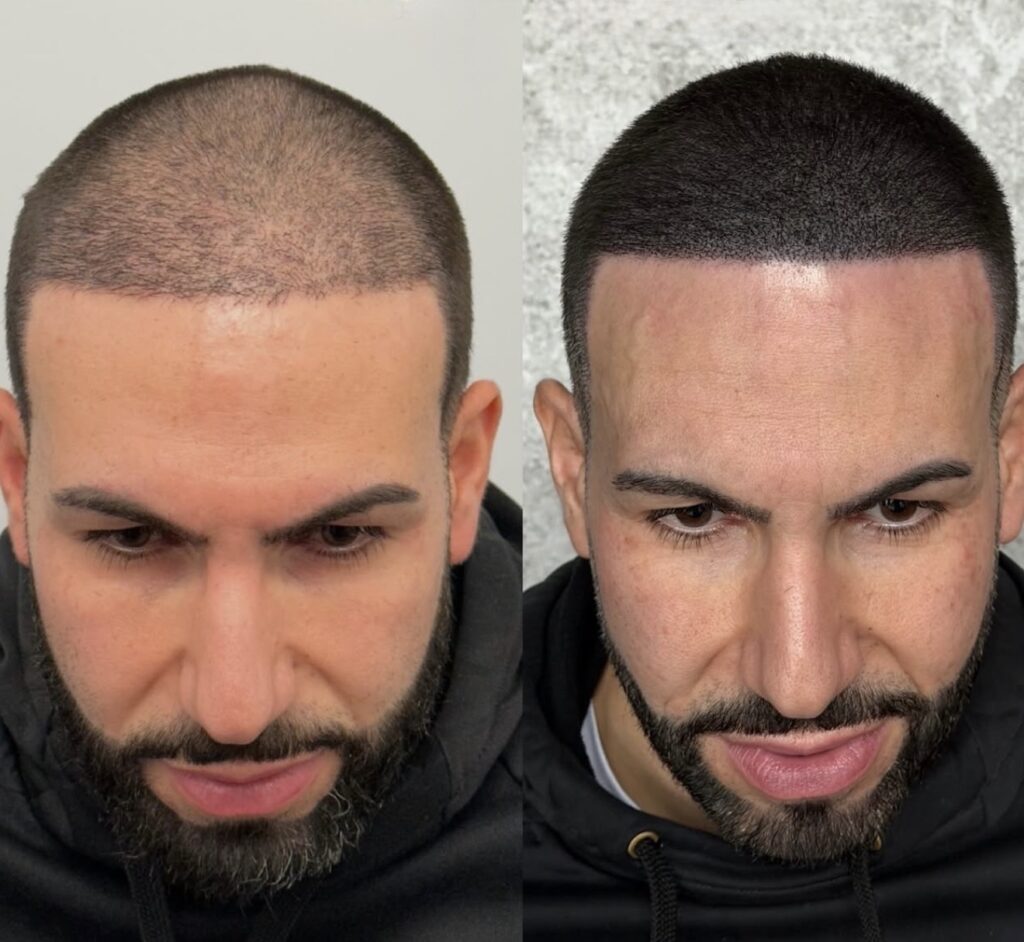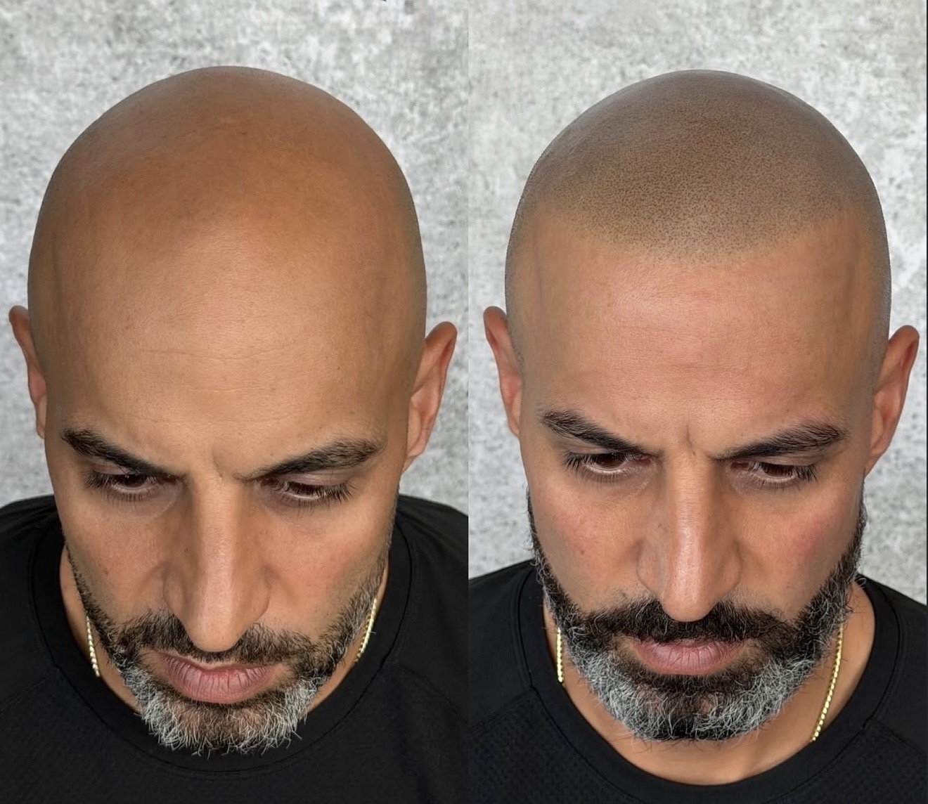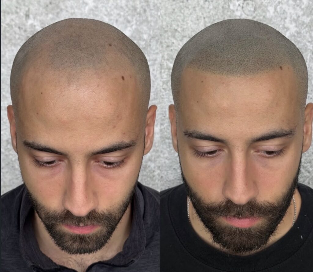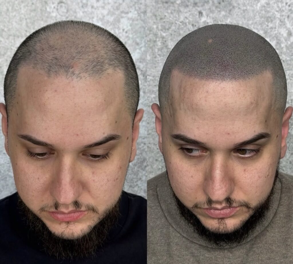 El resultado es un efecto de cabeza rapada completamente natural que disimula la calvicie, aumenta visualmente la densidad del cabello y mejora la imagen del rostro.